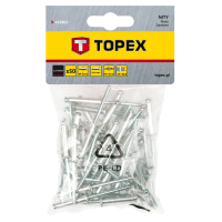 TOPEX hliníkové nity guľatou hlavou - plná zrnenia. Tento typ nitu poskytuje veľmi silné puto celý rad prvkov, ako je kov, drevo, plasty, koža, atď Rivet po montáži v otvore je daná od konca tŕňa, aby sa stáva trvalou odolať uvoľnenie spojenia. Brand TOPEX je určené DIY.