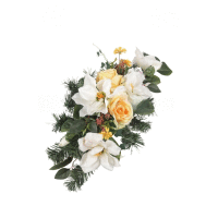 Aranžmán s chryzantémami, ružami, listami a doplnkami.