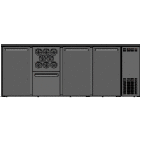 Barová chladnička s 3 plnými dverami, 2 zásuvkami vlastnej výroby disponuje ventilovaným chladením, 35% nižšou spotrebou energie, 3x2 výškovo nastaviteľnými kovovými policami, znútra nastaviteľnými nožičkami, farba vonkajšku antracitová, farba vnútrajšku strieborná, ekologickým chladivom, LED osvetlením (aj v zásuvkách), plne vysúvateľnými zásuvkami na teleskopických lištách, elektronickým termostatom s automatickým odmrazovaním, vymeniteľným testením dverí. Perforované otvory na stranách pre chladiče KEG sudov.