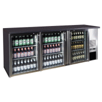 Barová chladnička z našej vlastnej produkcie sa vyznačuje vysokou kvalitou, tromi presklenými dverami, polyuretánovou izoláciou s hrúbkou 40 mm, automatickým odmrazovaním s elektronickou reguláciou, digitálnym displejom, dverami s automatickým zatváraním a štandardným zámkom, oddeleným vnútorným osvetlením, nastaviteľnými nohami a dvoma policami na každé dvere.