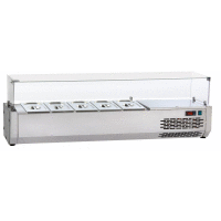 Nadpultový šalátový chladič disponuje digitálnym termostatom a piatimi 1/4 GN nádobami. GN nádoby sú súčasťou produktu.