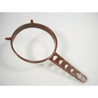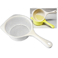 Plastový cedník s rúčkou a priemerom 8 centimetrov.