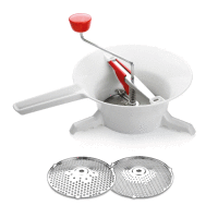 Určený pre jednoduché a rýchle pasírovanie zeleniny a ovocia, vynikajúci najmä na prípravu paradajkových, zemiakových, zeleninových a ovocných pretlakov a pyré. Dodávaný s 2 pasírovacími diskami, opatrený zhrňovacou lopatkou pre plynulé pasírovanie väčšieho množstva zeleniny alebo ovocia. Vyrobený z prvotriednej nehrdzavejúcej ocele a odolného plastu, vhodný do umývačky. 3 roky záruka.