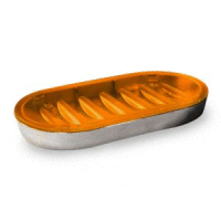 Obľúbená mydelnička oválneho tvaru, vyrobená z chrómovanej ocele, na nožičkách s gumennými koncami.