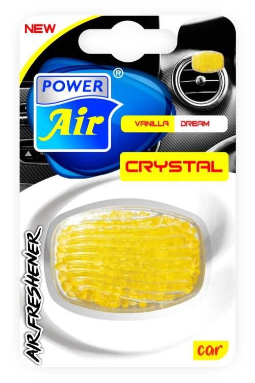 POWER AIR Crystal je osviežovač určený na inštaláciu do mriežky ventilátora. Sú to vonné perličky vyrobené z krásne parfumovaného granulátu, ktorý zabezpečuje postupné a dlhotrvajúce uvoľňovanie vône do interiéru vozidla. Osviežovač Crystal je k dispozícii v štyroch vôňach: Vanilla Dream, Breeze Fresh, New Car a Citrus Garden.