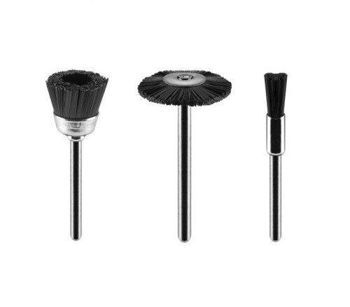 Nylonové kefy komplet, 55H068, GRAFIT, sada 3 druhov kief na minibrúsku. Sada obsahuje 3 tvary: štetec, pohár, tanier. Sú vyrobené z nylonového drôtu. Kefy sú určené na odstraňovanie nečistôt z hrdze, nečistôt, lakových náterov, vysávanie, leštenie a prípravu na čistenie jemných povrchov.