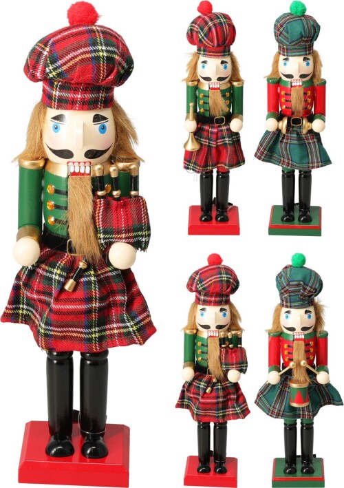 Urobte si sviatky ešte slávnostnejšími s naším vianočným luskáčikom. Figúrka z borovicového dreva, ktorá predstavuje slávneho Luskáčika v stoji v škótskom štýle. K dispozícii sú 4 modely (trúbka, bubon, gajdy, činel). Odetá do farebného tartanu, spája tradíciu s fantáziou. Ideálna na obohatenie vašej vianočnej výzdoby o klasický a príjemný nádych.