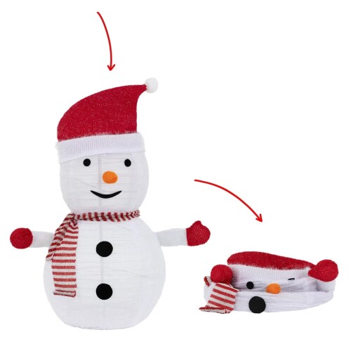 Vianočný snehuliak s 30 LED teplými diódami a časovačom. S jeho výškou 68 cm bude krásne vynikať v interiéri či exteriéri. Snehuliak s čiapkou, šálom a rukavicami obsahuje časovač, a je na batérie, ktoré nie sú súčasťou balenia. Vhodný do interiéru/exteriéru, skladací.