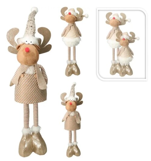 Očarujúci sob z textilu šampanskej farby s teleskopickými nohami, ktoré sa dajú nastaviť na výšku. Figúrka je vyrobená z polyesteru a železa, s jemnými detailmi a mäkkou výplňou, ktorá jej dodáva príťažlivý vzhľad. Vyberte si medzi dvoma krásnymi variáciami – chlapčenskou alebo dievčenskou – alebo ich nechajte spolu. Ideálny ako pútač pozornosti do obývačky, na krbovú rímsu alebo pri vianočnom stromčeku.