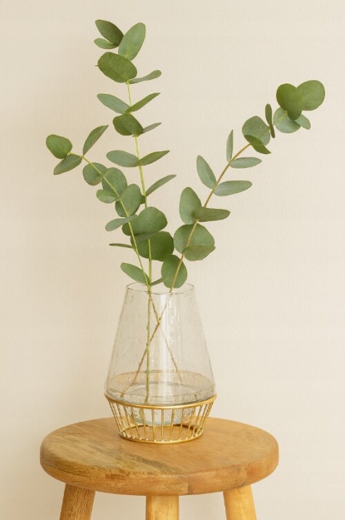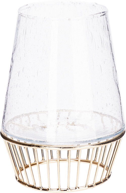 Moderná váza vyrobená z priehľadného skla, osadená na elegantnej kovovej základni v zlatej farbe. Možno ju použiť ako vázu na čerstvé alebo sušené kvety, ale aj ako svietnik na čajové sviečky alebo LED sviečky. Vďaka jemne sa rozširujúcej spodnej časti a stabilnej konštrukcii dokonale zapadne do aranžácie interiérov v štýle glamour, modernom, loftovom alebo boho.