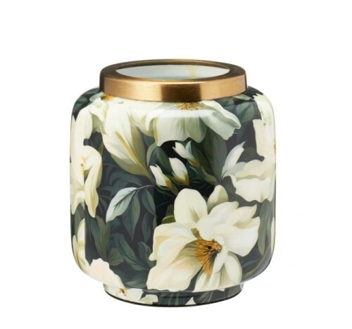 Štýlová váza vyrobená z polykarbonátu a kovu zdobená kvetinovou potlačou a zlatým okrajom je jedinečnou dekoráciou interiéru. Ideálna pre čerstvé a umelé kvety, ktoré zvýraznia eleganciu každého priestoru. Farebná kvetinová potlač. Zlaté zakončenie okrajov.