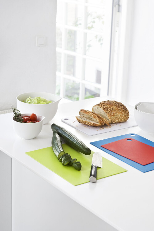 Flexibilná doska z hrubšieho rezného materiálu, vďaka ktorej môžete krájané a pripravené pokrmy vkladať priamo do panvice alebo do nádoby bez rozliatia. Rohový otvor na zavesenie. Doska je ponúkaná v troch farbách.