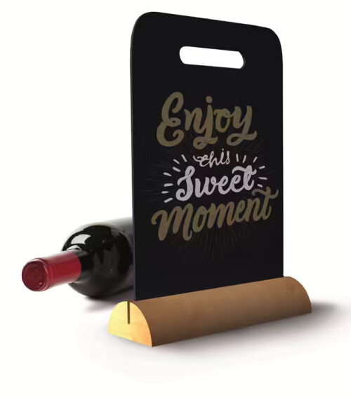 Tvarovaná stolná informačná tabuľka s dreveným podstavcom. Balenie obsahuje tvarovanú tabuľku, podstavec z kvalitného tvrdého dreva s povrchovou úpravou a 1 biely popisovač. Tabuľka vyzýva k nápaditým informáciám, ktoré je jednoducho možné prezentovať hosťom a návštevníkom.