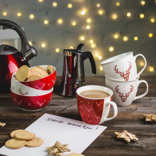 Winter je zimná kolekcia, v ktorej nájdete termosy, hrnčeky, misky a taniere, všetko sa vzormi sobov, vločiek alebo stromčekov.