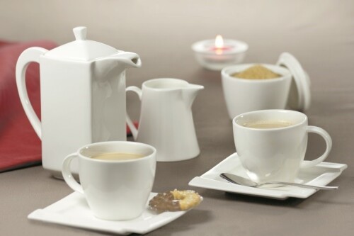 Kávová súprava Kubiko je vyrobená z kvalitného porcelánu vo farbe bieleho mramoru v kombinácii s výrazným štvorcovým tvarom tanierov, čo pridáva modernému vzhľadu.