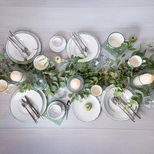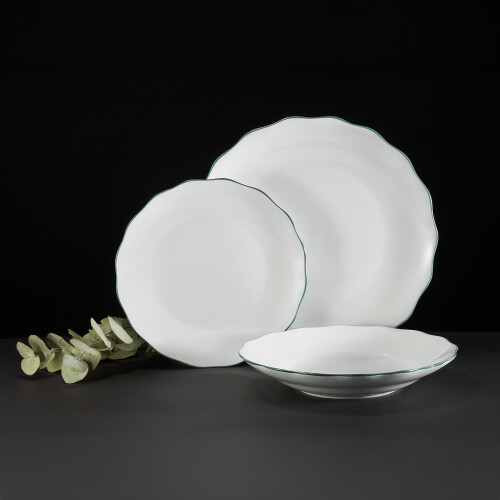 Súprava tanierov z kolekcie Verge kombinuje klasický vzhľad s moderným nádychom. Súprava je vyrobená z elegantného bieleho porcelánu a vyznačuje sa subtílnou zelenou linkou na okrajoch tanierov a tiež ich zvlneným tvarom. Každý prvok sady Verge bol navrhnutý s ohľadom na estetiku a jednoduché použitie. Taniere sú dokonale proporcionálne, ľahké, ale zároveň pevné a odolné voči každodennému používaniu. Taniere je možné umývať v umývačke riadu a používať v mikrovlnnej rúre. Kolekcia Verge je skvelou voľbou pre tých klientov, ktorí si cenia jednoduchosti, štýlu a odolnosti.