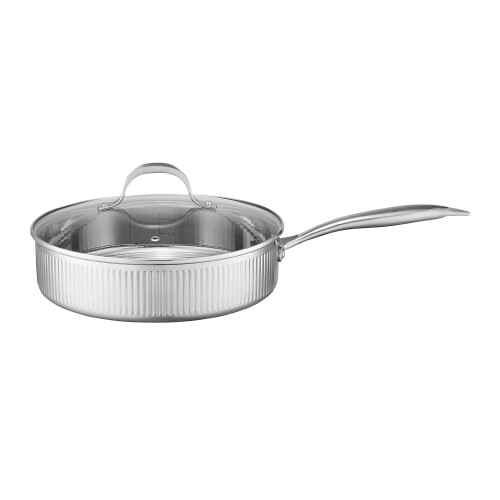 Hlboká panvica Curly Ambition s priemerom 26 cm je všestranný riad, vhodný na vyprážanie, dusenie a restovanie väčších porcií pokrmov. Je vyrobená z vysoko kvalitnej nerezovej ocele s trojvrstvovou technológiou a kombinuje odolnosť s vynikajúcim vedením tepla vďaka hliníkovému jadru, ktoré sa tiahne po celom povrchu panvice. Táto konštrukcia zaisťuje rovnomerné prehriatie dna a stien, čím minimalizuje riziko pripálenia pokrmov. Vnútro z nerezovej ocele 18/10 je odolné proti poškodeniu, nereaguje s potravinami a umožňuje bezpečné používanie pri vysokých teplotách. Panvica je dodávaná so sklenenou pokrievkou s otvorom na vypúšťanie pary. Je tiež vhodná do rúry do teploty 180°C. Vnútorná škála uľahčuje odmeriavanie tekutín, čo z nej robí mimoriadne praktickú voľbu pre každodenné varenie.